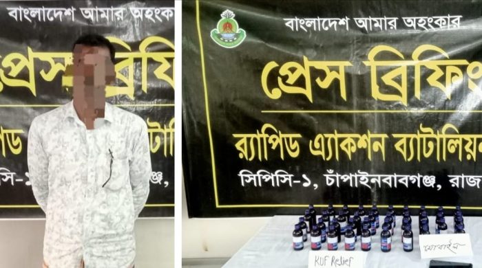 মাহিদুল ইসলাম ফরহাদ, চাঁপাইনবাবগঞ্জঃ চাঁপাইনবাবগঞ্জের শিবগঞ্জে র্যাব-৫ সদস্যরা অভিযান চালিয়ে মোটরসাইকেলের সিটের নীচ থেকে ৩৯ বোতল কাফ রিলিফ নামক সিরাপসহ রফিকুল ইসলামকে (৪৫) গ্রেফতার করেছে। গত বৃহস্পতিবার চাঁপাইনবাবগঞ্জ জেলার শিবগঞ্জ উপজেলার মনাকষা ইউনিয়নের read more